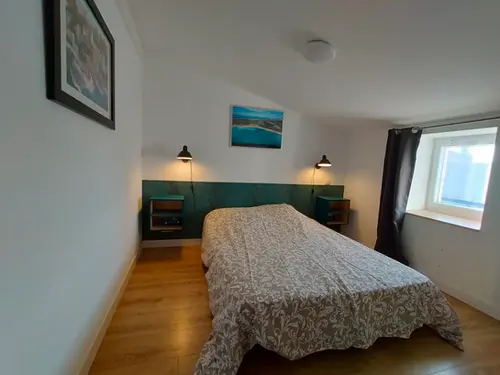 À l'étage : 2 chambres avec I lit double + 3 lits individuels (dont 1 lit superposé) + Salle d'eau avec WC - Draps et serviettes fournis sur demande.